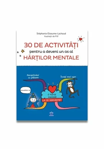 Hartile mentale, un instrument magic pentru a invata fara sa-ti dai seama! Ce este o harta mentala? Cum s-o citesti? Care sunt etapele pentru a o concepe? Caietul de activitati 30 de activitati pentru a deveni un as al hartilor mentale iti dezvaluie toate secretele hartilor mentale si te insoteste pas cu pas in initierea ta. Se adreseaza tuturor copiilor cu varsta peste 6 ani. Treptat, in decursul celor 30 de activitati, vei dezvolta 7 competente care-ti vor permite sa concepi chiar tu harti mentale. Lasa-te ghidat de Maestrul Hartomentalus si de acolitul sau, Sammy, si devino, cat ai pocni din degete, un as al hartilor mentale. Bonus: peste 100 de autocolante. Hartile mentale sunt un atu serios pentru facilitarea invatarii (concentrare, memorare, reflectie). Majoritatea creierelor copiilor apreciaza aceasta combinatie de cuvinte, imagini si conexiuni logice. Este chiar un ajutor pentru dislexie. Harta mentala este utilizata atat pentru a intelege lectiile, pentru a le insusi, cat si pentru a le restabili pe termen lung. De asemenea, este utila in viata de zi cu zi, de exemplu, pentru a prezenta organizarea zilei, o reteta sau regulile vietii de familie.