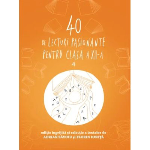 40 de lecturi pasionante pentru clasa a XII-a. Antologie de texte pentru clasa a XII-a Antologia de fata se adreseaza tuturor liceenilor, dar mai cu seama celor din clasa a XII-a, si propune o diversitate de texte si de autori, depasind "limitele" programei scolare - axata aproape exclusiv pe opere din literatura romana - prin deschiderea spre valori ale literaturii universale. Volumul cuprinde patru sectiuni: proza, poezie, dramaturgie si memorialistica. Adolescentii se vor putea intalni cu opere adecvate varstei, cautarilor si intereselor acestora, vor descoperi noi autori si vor parcurge si alte texte decat cele indeobste cunoscute, care poate nu mai "vorbesc" generatiei actuale.