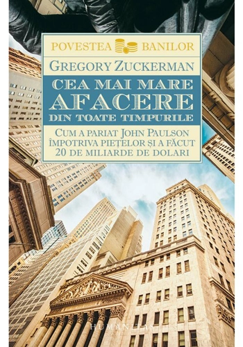 Traducere de Dana Georgescu In 2006, John Paulson, managerul unui fond speculativ, a prezis un eveniment pe care putini il anticipau: piata ipotecara avea sa se prabuseasca in scurt timp. Gregory Zuckerman prezinta povestea lui si a altor outsideri – investitori putin cunoscuti – din lumea investitiilor care ii impartaseau viziunea sceptica, reusind sa obtina in final castiguri de miliarde de dolari. Scrisa de un triplu castigator al Premiului Gerald Loeb, cea mai inalta distinctie oferita unui jurnalist in domeniul economic, Cea mai mare afacere din toate timpurile este istoria fascinanta a bulei pietei ipotecare si a neputintei celor de pe Wall Street de a prevedea iminenta criza economica. „Zuckerman este un jurnalist de prima marime, capabil sa explice pe intelesul tuturor lumea complexa a creditelor ipotecare. Pe alocuri, Cea mai mare afacere din toate timpurile se citeste ca un thriller.“ – New York Times „In Cea mai mare afacere din toate timpurile, Zuckerman arata cum Paulson si alti outsideri au dat lovitura anticipand dezastrul si profitand de pe urma lui. O poveste fascinanta.“ – Business Week „Cea mai valoroasa expunere a bizarelor si captivantelor evenimente care au dus la criza financiara.“ – MICHAEL LEWIS „De departe cea mai buna carte despre criza financiara.“ – MALCOLM GLADWELL