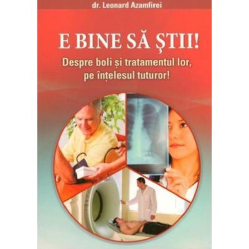 E bine sa stii! mai multe despre sanatate, prevenirea imbolnavirilor si despre boala cat mai devreme, pana cand aceasta nu devine atat de grava, incat nu mai poate fi tratata. Spre acest precept ne indeamna autorul in acest adevarat „tratat de medicina preventiva si curativa”, scris pe intelesul tuturor. Ceea ce reuseste autorul cu prisosinta este adaptarea limbajului medical, inevitabil asociat cu o terminologie specifica, la stilul adecvat intelegerii de catre toti, indiferent de gradul de cultura. In cuprinsul cartii sunt trecute in revista angina pectorala, infarctul miocardic, infectiile, cancerul, diabetul, agresiunile din mediul extern etc. De un real interes sunt notiunile de prim ajutor in diferite stari de urgenta - stop cardiac, intoxicatii, accidente etc. Un intreg capitol este consacrat aspectelor de etica medicala, cu probleme la ordinea zilei, intens dezbatute in lumea medicala si in mass-media, respectiv eutanasia, transplantul de organe si clonarea. In subimpartirea dedicata „capcanelor” medicinei neconventionale, autorul pledeaza pentru o armonie inteligenta intre medicina alopata si cea neconventionala, alternativa. Capitolul despre „relatia cu lumea medicala„ prezinta o importanta deosebita in ce priveste cooperarea armonioasa medic-pacient. Cartea se incheie cu un „ghid de interpretare a analizelor medicale uzuale” foarte bine-venit. Doctorul Leonard Azamfirei este profesor universitar la Universitatea de Medicina si Farmacie din Targu-Mures si medic primar anestezie-terapie intensiva in cadrul Spitalului Clinic Judetean de Urgenta, Targu-Mures. Este doctor in medicina din anul 1995. A publicat 14 carti de specialitate si peste 180 de lucrari stiintifice in domeniu. A participat la specializari in Olanda, Ungaria, SUA, Japonia. Este implicat si in activitatea de medicina preventiva, sustinand numeroase prelegeri de educatie sanitara. In acelasi timp, este redactor la revista Viata + Sanatate, inca de la infiintarea acesteia.