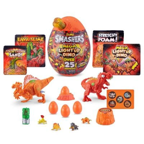 Zdrobiti si deschideti noul Smashers Mega Light Up Dino pentru a descoperi cele 25 de surprize din interior. Gasiti toate piesele pentru a incepe sa construiti fie Dino T-REX, fie Spinosaurus. Razuiti si gasiti indicii ascunse: Folositi harta oficiala Dino Light Up Scratch pentru a gasi toate piesele ascunse din interior. Colectionati compusi precum Fossil Rock, Lava Slime si altele! Excavati toate noile surprize: Peste 25 de surprize ascunse in lava! Gasiti partile unuia dintre celor doi dinozuri si construiti-va propriul dinozaur T-Rex sau Spinosaurus! Joaca cu sunete salbatice: Introduceti ADN-ul Dino in Dino Smash-o-saur si atingeti coada lui Dino pentru a activa sunetele! Colectioneaza si lupta: colectioneaza ouale surpriza Smashers si creeaza cea mai epica lupta intre dinozaurii tai de lava! Cine va castiga? Include: 1 ou de dinozaur, 1 gentuta meteorit, 1 harta, 5 stickere fosforescente, 1 slime fosforescent, 1 lava vulcanica efervescenta, 1 nisip care-si schimba culoarea, 1 spuma vulcanica elastica, 4 mini oua cu 4 personaje, 1 ou care se poate reconstrui, 1 smash-o-saur, 1 fiola ADN din plastic, 1 instructiuni, 1 ghidul colectionarului. Varsta recomandata 3+. Atentie! Contraindicat copiilor mai mici de 3 ani. Jucaria/produsul poate contine piese mici care se pot inghiti sau inhala, existand pericolul de sufocare. Nu lasati ambalajele jucariilor/produselor la indemana copiilor. Indepartati orice ambalaj al jucariei/produsului inainte de a da jucaria/produsul copilului. Va rugam sa supravegheati copilul in timp ce se joaca/foloseste acest produs. Pastrati instructiunile si etichetele pentru referinte viitoare. Pastrati jucaria/produsul departe de foc, feriti jucaria/produsul de temperaturi ridicate si umiditate.
