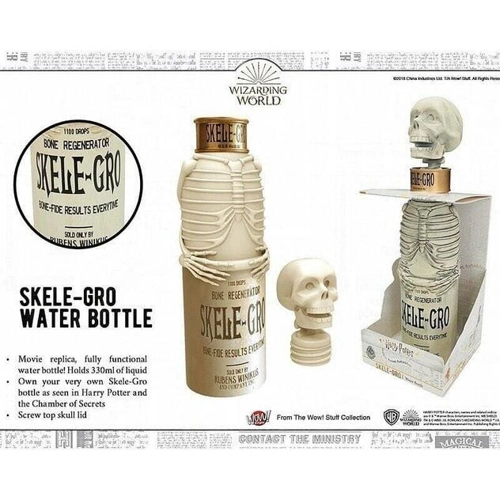 Sticla Skele-Gro, replica din Harry Potter și Camera Secretelor, are un capac-craniu perfect funcțional și poate transporta până la 300 ml de apă sau din sucul tău preferat, pentru a te menține hidratat întreaga zi. Vârstă recomandată: 6ani+. Avertisment: Nu este recomandat copiilor sub 3 ani. Pericol de asfixiere. Conține piese mici ce pot fi înghițite.