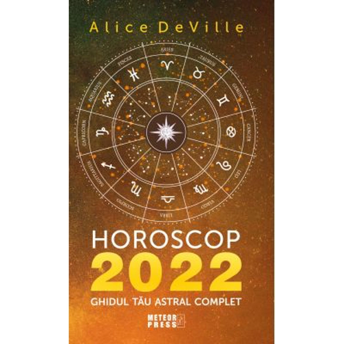 Horoscop 2022. Ghidul tau astral complet de Alice DeVille Aveti sansa sa va planificati cel mai bun an urmarind previziunile astrologice si analiza detaliata pentru fiecare dintre cele 12 zodii. Veti afla cum sa faceti alegeri intelepte pentru a profita de oportunitatile ivite luna de luna. Fie ca va doriti o noua iubire, relatii mai satisfacatoare, un loc de munca mai bun, o cariera de succes sau o binemeritata vacanta, informatiile din aceasta carte va vor ajuta sa va atingeti obiectivele si sa atrageti norocul pe parcursul intregului an. • Descoperiti in ce domenii din viata dumneavoastra puteti obtine cele mai frumoase reusite si caror directii trebuie sa le acordati mai multa atentie. • Utilizati tabelele care precizeaza momentele cele mai favorabile pentru intreprinderea unor actiuni importante. • Cititi descrierile detaliate ale personalitatii nativilor fiecarei zodii, cu accentuarea punctelor forte si a talentelor, a valorilor si resurselor personale. • Analizati influentele planetelor si eclipselor, pentru a afla din timp care sunt momentele cele mai potrivite daca urmariti un anumit scop, de natura personala, profesionala, financiara sau sentimentala. • Cititi prezentarea generala a anului 2022. • Consultati principiile de baza ale astrologiei intr-un rezumat pentru incepatori. Alice DeVille este cunoscuta pe plan international ca astrolog, scriitoare si consultanta specializata in practici de afaceri, managementul carierei si al schimbarii, afaceri imobiliare, sanatate, relatii si dezvoltare personala.