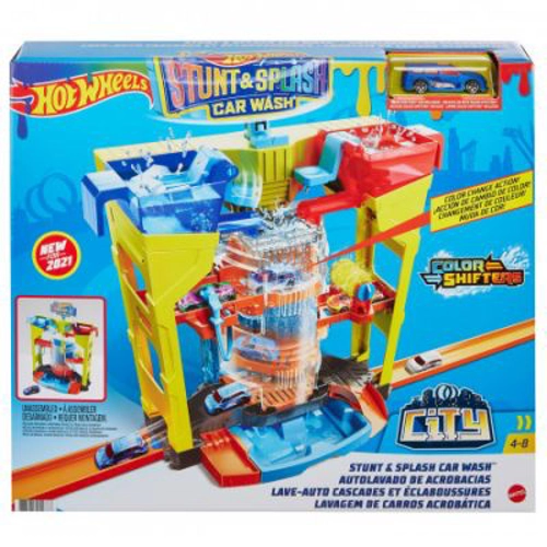 Setul de joaca The Hot Wheels Stunt Splash Car Wash combina elemente practice ale unei spalatorii auto reale cu lumea plina de actiune a Hot Wheels. Un lift cu manivela transporta masinile printr-un aranjament complex care duce la o conducta de apa, unde copiii dau drumul la apa pe masini. Copiii controleaza daca apa este calda sau rece, schimband culoarea oricarui vehicul Hot Wheels Color Shifter. Hot Wheels Stunt Splash Car Wash se conecteaza la alte seturi din orasul Hot Wheels (vandute separat) pentru aventuri in tot orasul. Copiii cu varsta de 4 ani si mai mari vor avea ore intregi de joaca palpitanta cu acest set. Culorile si decoratiunile pot varia.