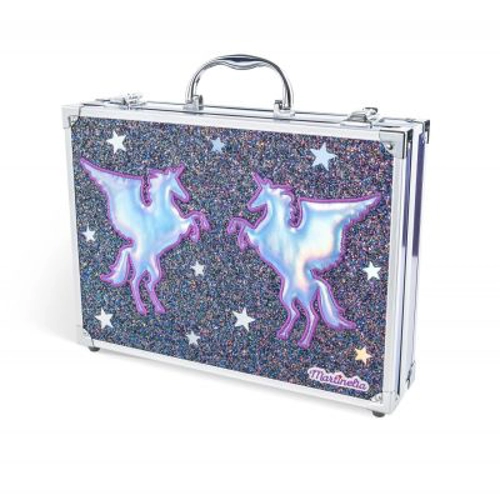 Aceasta trusa completa de machiaj cu sclipici include doua sticlute cu sclipici Pegasus, 36 de farduri de pleoape in toate culorile tale preferate, 4 rujuri, 4 creioane de buze, 4 luciuri de buze, 3 lacuri de unghii cu sclipici, 2 farduri de obraz, 9 pensule si o oglinda.